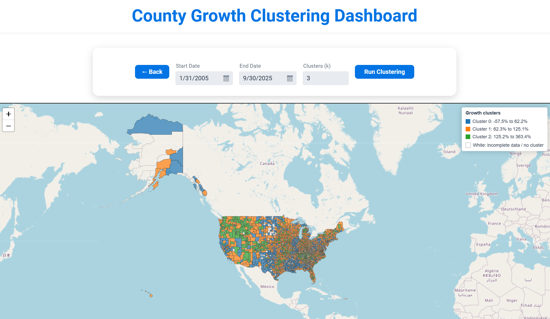 For the clustering itself, we used the SMILE library to cluster counties based on their percent growth. This allowed us to group counties into categories such as low growth, medium growth, and high growth.